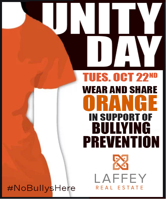 October is National Bullying Prevention Month.  Laffey Real Estate stands with the country to encourage schools, communities and organizations to work together to stop bullying and cyberbullying. The goal is end to hatred and racism by increasing awareness of the prevalence and impact of all forms of bullying on all children and adults of all ages.  Show your support with your Orange!!
